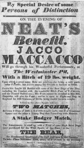 His mode of attack, or rather of defence, was, at first, to present his back or neck to the dog, and to shift and tumble about until he could lay hold on the arm or chest, when he ascended to the windpipe, clawing and biting away, which usually occupied him about one minute and a half, and if his antagonist was not speedily with drawn, his death was certain; the monkey exhibited a frightful appearance, being deluged with blood - but it was that of his opponent alone; as the toughness and flexibility of his own skin rendered him impervious to the teeth of the dog.[2]