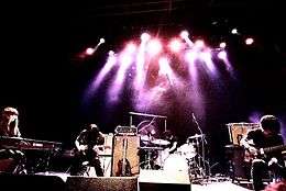 In terms of instrumentation, Mono is a four-piece instrumental rock band. Goto, the group's frontman, is the lead guitarist and uses a 1966 Fender Jazzmaster through Boss, Danelectro, SiB, and Morley effects pedals, into a Fender Twin, a Marshall JCM 2000 head, and a Marshall cabinet for amplification.[17] Yoda, the rhythm guitarist, uses a 1974 Fender Stratocaster through Boss, Tech 21 and Pro Co effects pedals, into a Fender Twin for amplification.[17] Kunishi, the group's bass guitarist, pianist and occasional guitarist uses a 1966 Gibson EB-3 through Boss, TC Electronic, and Tech 21 effects pedals, into an Ampeg B2-R head and a Sunn bass cabinet, as well as a Fender Rhodes, and a Fender Jazzmaster.[17] Takada, the drummer, uses a four-piece 1970s Ludwig drum kit, with Zildjian, Sabian, and Paiste cymbals, as well as a Korg microKORG synthesizer.[17]