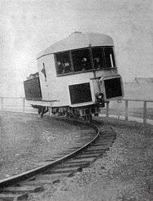 Perhaps the only true monorail was the Gyro Monorail developed independently by Louis Brennan, August Scherl and Pyotr Shilovsky. This was a true single track train which used a gyroscope-based balancing system to remain upright. All were demonstrated by full-scale prototypes, but development was effectively stopped by the First World War. Brennan's design was given serious consideration for the North-West Frontier of India, and a Schilovski monorail was proposed by the USSR government between Leningrad and Tsarskoye Selo in 1921.[13] Considering the volatility of the regime at that time, it is not surprising that funds ran out shortly after construction began.