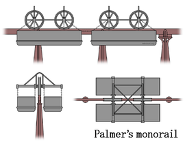 The earliest patent for a vehicle designed to run on a single rail can be traced to UK patent No 4618 dated 22 November 1821. The inventor was Henry Robinson Palmer, who described it as 'a single line of rail, supported at such height from the ground as to allow the centre of gravity of the carriages to be below the upper surface of the rail'. The vehicles straddled the rail, rather like a pair of pannier baskets on a mule. Propulsion was by horse.[1] A line was built in 1824 in the Deptford Dockyard in London, and in 1825, another line was built in Cheshunt, Hertfordshire. Dubbed the Cheshunt Railway, this line made history as it was the world's first passenger-carrying monorail, and the first railway line to open in Hertfordshire.[2][3] In 1826 a company was formed to construct a line between Barmen and Elberfeld in Germany, but construction never started.