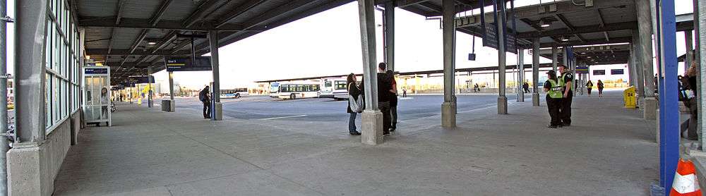 A large bus terminal with 10 platforms and an indoor waiting area adjoins the station. The building, which is owned by the AMT features an AMT ticket counter as well as a convenience store and a coffee shop. In addition, the station has parking for 1342 cars — 644 free outdoor park and ride spaces and 698 paying spaces (54 outdoor, 644 indoor).[3] The indoor spaces cost $7 a day or $80 per month (if a user purchases a monthly parking pass). All bus traffic enters and leaves on Boulevard de l'Avenir.