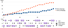 The simulation can be repeated several times to simulate multiple rounds of the game. The player picks one of the three cards, then, looking at the remaining two cards the 'host' discards a goat card. If the card remaining in the host's hand is the car card, this is recorded as a switching win; if the host is holding a goat card, the round is recorded as a staying win. As this experiment is repeated over several rounds, the observed win rate for each strategy is likely to approximate its theoretical win probability.