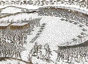 The Saadian ruler Mohammed ash-Sheikh sent an army of 30,000 men, led by his son Muhammad al-Harran, to invade Tlemcen in 1551.[3] They took the city easily, from which the Ottoman garrison had been removed in 1547. The Saadian army continued to the Ottoman stronghold of Mostaganem, but failed to capture the city.[3] On this occasion, the Emir of the Banu, which had been an enemy of the Ottomans for 30 years, actually sided with the Ottomans against the Saadians, and provided troops.[3] The Moroccan Saadian army was repulsed by the combinaison of tribal troops and Ottoman Janissaries led by Hasan Qusru.[3] Al-Harran died of illness in Tlemcen.[3] The last Zayyanid ruler of Tlemcen, Hasan, fled to Spain, and died there a few years later.[3]