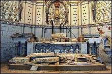 There is one central aisle with two narrower ones on either side. There are columns, each supporting a Gothic arch, either side of the main aisle, six from the back to the chancel. From there, there are seven steps leading up to the sanctuary with two more columns until the bay-shaped sanctuary. The bay has three gothic arches around it, separating it from the back east side of the church. The altar is marble, but the top surface of it has been smashed into pieces since the church was closed. Around the altar are three sculptures set into the wall. The centre one depicts angels; the north side one depicts church leaders and saints; and the south side one depicts royalty, all kneeling towards an emblem of the Blessed Sacrament being crowned by the angels.[8]