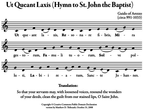 In the eleventh century, the music theorist Guido of Arezzo developed a six-note ascending scale that went as follows: ut, re, mi, fa, sol, la, and named the Aretinian syllables after himself. A seventh note, "si" was added shortly after.[7] The names were taken from the first verse of the Latin hymn Ut queant laxis, where the syllables fall on their corresponding scale degree.