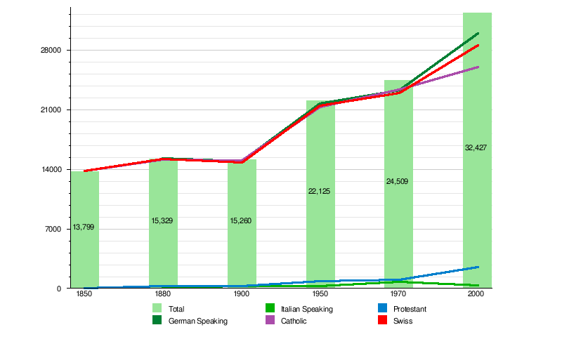 | Year | Total Population | Total population change ‰ 1 | Rate of natural increase ‰ 1 | Net migration rate ‰ 1 | % population over 59 | German Speaking | Italian Speaking | French Speaking | Romansh Speaking | Other Languages | Roman Catholic | Protestant | Christian Catholic | Other | Other - not member | Other - Islamic | Other - Jewish | Swiss | Resident Foreigner | % resident foreigner |