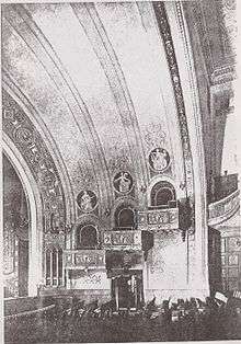 The construction of the Murphy was a massive undertaking. Over 175 cars were used in the construction of the Murphy. The materials used in the construction included: 1 car of metal lathe and tile 17 cars of hollow tile 19 cars of solid brick (850,000) 2 cars of terra cotta 4 cars of lumber 2 cars of brick-layers cement 12 cars of cement 3 cars of lime 4 cars of plaster 2 cars of reinforcing steel rebar 10 cars of structural and ornamental steel 2 cars of cinders 1 car of cut stone 70 cars of sand and gravel 3 cars of mill work 4 cars of material for heating system and 1 car of material for electrical work it also included the lights,curtains,and ropes.[1] Charles Murphy hired The Mandel Brothers, a prestigious interior decorating firm from Chicago, to decorate the interior.[2] The total cost of the undertaking was in excess of $250,000 (equivalent to $3,939,712 in 2015).[1][2]