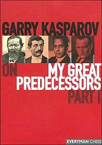 My Great Predecessors is a series of chess books written by former World Champion Garry Kasparov. The five volumes in the My Great Predecessors series are about the players who preceded Kasparov in being official World Champions. The series of books continued with the Modern Chess volumes that covers developments in the 1970s and Kasparov's games with Anatoly Karpov. The series is being extended with three volumes of Garry Kasparov on Garry Kasparov, covering his other games. The books contain historical details, but for the most part the books are made up of annotated games.