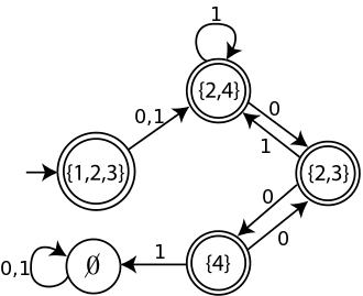 The initial state of the DFA constructed from this NFA is the set of all NFA states that are reachable from state 1 by ε-moves; that is, it is the set {1,2,3}. A transition from {1,2,3} by input symbol 0 must follow either the arrow from state 1 to state 2, or the arrow from state 3 to state 4. Additionally, neither state 2 nor state 4 have outgoing ε-moves. Therefore, T({1,2,3},0) = {2,4}, and by the same reasoning the full DFA constructed from the NFA is as shown below.