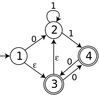The NFA below has four states; state 1 is initial, and states 3 and 4 are accepting. Its alphabet consists of the two symbols 0 and 1, and it has ε-moves.