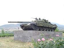 A restored Armenian T-72, knocked out of commission while attacking Azeri positions in Askeran District, serves as a war memorial on the outskirts of Stepanakert.