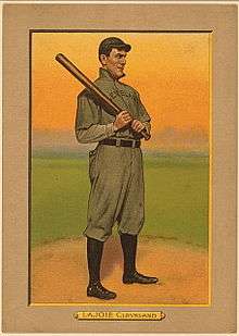 The elder Lajoie, who worked as a teamster and laborer, died not long into the younger Lajoie's childhood, which forced him and his siblings to work to support the family.[9]:p.39 Lajoie dropped out of school to work in a textile mill. He also began playing semi-professional baseball for the local Woonsocket team under the alias "Sandy", because his parents did not approve of their son playing baseball. He earned money as a taxi driver with a horse and buggy and locally was called "Slugging Cabby."[4]:p.88[9]:p.40 "When I told my father I had decided to take the job he was very angry. He shouted that ball players were bums and that nobody respected them, but I was determined to give it a try at least one season", Lajoie later said.[10] He also received the nickname "Larry" from a teammate who had trouble pronouncing Lajoie.[10] Lajoie admired baseball players such as King Kelly and Charles Radbourn.[11]:p.179