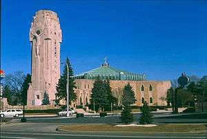 A dramatic limestone Art Deco tower called the Charity Crucifixion Tower, completed in 1931, features integrated figural sculptures by Rene Paul Chambellan, including a large figure of Christ on the cross, 28 ft (8.5 m) high on the Woodward Avenue façade. It was built as a response to the Ku Klux Klan as a "cross they could not burn".[10] The sides and rear feature windows inside the crucifix which can be lit from within. At the upper corners of the tower are symbols of the Four Evangelists. Carved below the feet of the figure of Christ are the Seven Last Words. Just below them is a doorway with "Charity" and "Christ Crucified" carved above it. On the sides of the doorframe are depictions of items associated with the Passion. The doorway leads to a small balcony which can serve as a pulpit. On the front are carved depictions the Archangels Jophiel, Raphael, Michael, Gabriel and Uriel. The pulpit is flanked by depictions of John the Apostle and the Virgin Mary to the left and a Roman Centurion holding a spear and Mary Magdalene on the right.[11] Across the terrace facing the crucifix a depiction of Saint Thérèse of Lisieux is carved into the surrounding wall. This sculpture is also by Chambellan.
