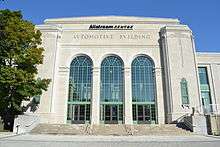 Located immediately inside the entrance to the Princes' Gates on the south side of Princes Boulevard, the building was initially used to display the latest car models to the public. The exhibition of automobiles at the CNE began in 1897. In 1902, the Transportation Building was built to hold all types of transportation displays. The display of automobiles grew and by 1916, was named the National Motor Show. By 1928, the size of the automobile exhibit had overflowed the Transportation Building and a design competition was held to build a new building. The new building was completed in time for the following CNE. The last National Motor Show was held in 1967.[16]