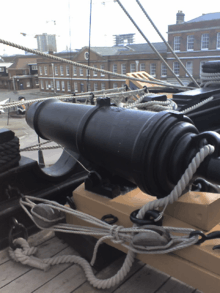 The linstock slow match or the spark from the flintlock ignited the priming powder, which in turn set off the main charge, which propelled the shot out of the barrel. When the gun discharged, the recoil sent it backwards until it was stopped by the breech rope, a sturdy rope made fast to ring bolts let into the bulwarks, with a turn taken about the gun's cascabel (the knob at the end of the gun barrel).
