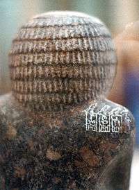 Little is known about Nebra's reign. The discovery of sealings bearing Nebra's name together with sealings of Hotepsekhemwy at Saqqara suggests that Nebra conducted the burial of Hotepsekhemwy and was his direct successor.[17] Additional confirmation of this succession is provided by a statue [18] and a stone bowl both bearing Hotepsekhemwy and Nebra's serekhs in juxtaposition. Other pot inscriptions and seal impressions surviving from his time only name cult-related and administrative events, such as the "Erecting of the pillars of Horus". Under Nebra, the first depiction of the goddess Bastet occurs. The exact duration of Nebra's reign is the subject of investigations. Reconstructions of the well known Palermo Stone, a black basalt table presenting the yearly events of the kings from the beginning of the 1st dynasty up to king Neferirkare in the shape of clearly divided charts, leads to the conclusion that Nebra and his predecessor, king Hotepsekhemwy, ruled altogether for 39 years. Since Nebra has fewer records of his rule than Hotepsekhemwy, Nebra is thought to have ruled for a shorter time. The calculations differ from 29 and 10 years to 25 and 14 years.[19][20][21]