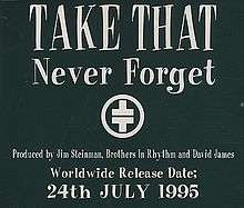 "Never Forget" is a 1995 song recorded by English band Take That, from the album Nobody Else. The song features Howard Donald on lead vocals. It was released on 24 July 1995, and achieved success in many countries, including the UK,[1] Spain, Latvia and Ireland where it topped the singles chart.