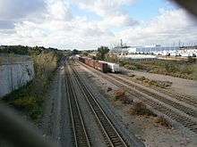 The New Jersey Midland Railway (NJM) was formed in 1870 as a consolidation of several smaller railroads.[2] The original plan was to cut through the Hudson Palisades near Englewood and run south along the Hudson River to Weehawken, but the company lacked the money to do so, and instead made arrangements to run through the Pennsylvania Railroad's cut from Marion Junction through Bergen Hill in Jersey City to their Exchange Place Terminal.[3]