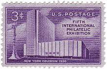The Coliseum, which replaced the Circle Building[2] and smaller tenement and retail buildings,[1] opened on April 28, 1956, with three exhibitions: the New York International Auto Show, the National Photographic Show, and the Fifth International Philatelic Exhibition.[1] A U.S. postage stamp commemorates the show and the building. Through 1986, the Coliseum hosted 1,246 events.[1]