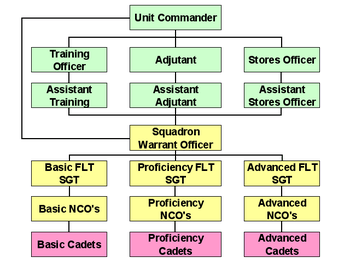 How an individual unit is organised varies widely. A unit's organization depends on its size, number of officers, number of Cadet NCOs, facilities, and the organisational preference of the Cadet Unit Commander.