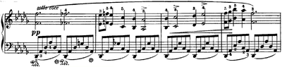 A sonorous foundation for the melodic line is provided by the widely spaced notes in the accompaniment, connected by the damper pedal. The waltz-like accompaniment gently emphasizes the 12/8 meter, 12 beats to the measure subdivided into four groups of 3 beats each.