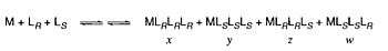 A higher level of modeling, the ML3 model involves four active catalytic complexes: MLRLRLR, MLSLSLS, MLRLRLS, MLSLSLR. Unlike the ML2 model, where only the two homochiral complexes reacted to form enantiomerically enriched product, all four of the catalytic complexes react enantioselectively. However, the same steady state assumption applies to the equilibrium between unbound and bound catalytic complexes as in the more simple ML2 model. This relationship is shown below in Figure 7.
