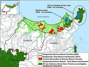 - ↑ "Para declarar y designar como reserva natural todo terreno público y patrimonial perteneciente o administrado por cualquier agencia, corporación pública o instrumentalidad del Gobierno de Puerto Rico en el área del Corredor Ecológico del Noreste, localizado en la costa de los municipios de Luquillo y Fajardo, y para establecer como política pública la preservación, restauración y conservación de dicha reserva." (PDF). Senado de Puerto Rico. 22 September 2011. Retrieved 13 January 2012.