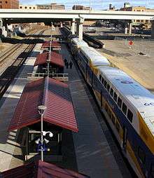 The Northstar Line (reporting mark MNRX) is a commuter rail route in the US state of Minnesota. Northstar runs 40 miles (64 km) from Big Lake to downtown Minneapolis at Target Field using existing track and right-of-way owned by the BNSF Railway. Passenger service began on November 16, 2009.[1][3] The rail line serves part of the Northstar Corridor between Minneapolis and St. Cloud. Planning for the line began in 1997 when the Northstar Corridor Development Authority (NCDA) was formed.[5] The corridor is mostly served by Interstate 94 and U.S. Highway 10.