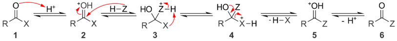 Under acidic conditions, the carbonyl group of the acyl compound 1 is protonated, which activates it towards nucleophilic attack. In the second step, the protonated carbonyl (2) is attacked by a nucleophile (H−Z) to give tetrahedral intermediate 3. Proton transfer from the nucleophile (Z) to the leaving group (X) gives 4, which then collapses to eject the protonated leaving group (H−X), giving protonated carbonyl compound 5. The loss of a proton gives the substitution product, 6. Because the last step involves the loss of a proton, nucleophilic acyl substitution reactions are considered catalytic in acid. Also note that under acidic conditions, a nucleophile will typically exist in its protonated form (i.e. H−Z instead of Z−).