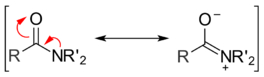 Another factor that plays a role in determining the reactivity of acyl compounds is resonance. Amides exhibit two main resonance forms. Both are major contributors to the overall structure, so much so that the amide bond between the carbonyl carbon and the amide nitrogen has significant double bond character. The energy barrier for rotation about an amide bond is 75–85 kJ/mol (18–20 kcal/mol), much larger than values observed for normal single bonds. For example, the C–C bond in ethane has an energy barrier of only 12 kJ/mol (3 kcal/mol).[3] Once a nucleophile attacks and a tetrahedral intermediate is formed, the energetically favorable resonance effect is lost. This helps explain why amides are one of the least reactive acyl derivatives.[4]