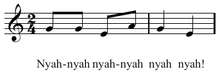 - ↑ Sometimes five-note, with the first two notes combined as one long note ("Nyaaahh nyah nyah nyah nyah") or other variations, such as the third note shortened or the fifth note stressed in volume, intonation, or duration, and so forth.