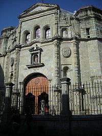 Church of the Company of Jesus (Iglesia de la Compañia de Jesús), located to the southwest of the Zócalo, was built by the Jesuits in 1579 and consecrated to Francis Xavier and the Immaculate Conception.[17] The towers were destroyed by a series of earthquakes and never rebuilt. Inside the chapel is a statue of the Virgin of Guadalupe with a prayer written in Spanish, English, Náhuatl as well as 12 other languages native to the state of Oaxaca, including 4 dialects of Zapotec.[4]