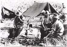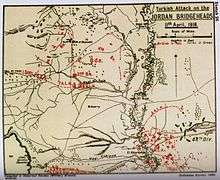 Shortly after the withdrawal from Amman a force of seven Ottoman aircraft bombed the Jordan Valley garrison and on 11 April 1918 a series of Ottoman attacks were made on Ghoraniyeh bridgehead, on El Mussallabeh hill and on the Auja position.[34][35][36] This attack is referred to by the British as the 'Turkish Attack on the Jordan Bridgeheads'.[37]