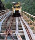 The dam's flume consists of a wooden trough situated upon a shelf carved out of the cliffside. The trough carries the water to a point just above the powerhouse where it drops the water 250 feet (76 m) through two large steel pipes to the powerhouse below. Without this flume system, the dam (at just 30 feet high) would be practically useless as a power plant.[1]