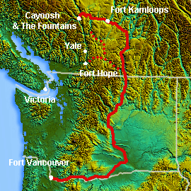 The Okanagan Trail was an inland route to the Fraser Canyon Gold Rush from the Lower Columbia region of the Washington and Oregon Territories in 1858-1859. The route was essentially the same as that used by the Hudson's Bay Company fur brigades, following the Columbia River to the confluence of the Okanogan River, and then up that river's watercourse via Osoyoos, Skaha (Dog) and Okanagan Lakes, then using a pass via Monte Creek to Fort Kamloops, at the confluence of the North and South Thompson Rivers. The route then went west from there down the Thompson River either to the lower gold-bearing bars of the Fraser River between what is now Lytton, British Columbia and Yale, British Columbia, or via Hat Creek and Marble Canyon to the upper Fraser goldfields around present-day Lillooet, British Columbia. A shorter branch-route to the lower Thompson and lower Fraser Canyon diverged from the main route at the confluence of the Similkameen River and the Okanogan (at present-day Oroville, Washington). Cayoosh and The Fountains are today's Lillooet, British Columbia and environs.