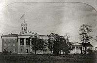 Plans for the construction of Old Main began on March 13, 1834, when the Board of Trustees of Washington College approved a motion to build a building, with a maximum budget of $6,500.[2] Since only $5,000 of the construction cost was to come from general College funds, a fundraising committee was appointed on March 26, 1835 to solicit donations.[2] The specific dates of groundbreaking and completion are unknown, but it was used for commencement ceremonies in 1836.[2] Upon its completion, the building stood three stories high and had facilities for large gatherings on the first floor and classrooms on the second and third.[2] This initial phase of construction survives in the original building as the center-rear portion.[2] The new building was called "the New College," to distinguish it from the College's original building, McMillan Hall.[2] A second early phase of construction took place between 1847 and 1850, when the building received two additional wings, a dome, and a colonial facade to match that of McMillan Hall.[2]