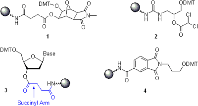 - Special solid supports are used for the attachment of desired functional or reporter groups at the 3’-terminus of synthetic oligonucleotides. For example, the commercial[89] solid support 4[90] allows the preparation of oligonucleotides bearing 3’-terminal 3-aminopropyl linker. Similarly to non-nucleosidic phosphoramidites, many other special solid supports designed for the attachment of reactive functional groups, non-radioactive reporter groups, and terminal modifiers (e.c. cholesterol or other hydrophobic tethers) and suited for various applications are commercially available. A more detailed information on various solid supports for oligonucleotide synthesis can be found in a recent review.[78]