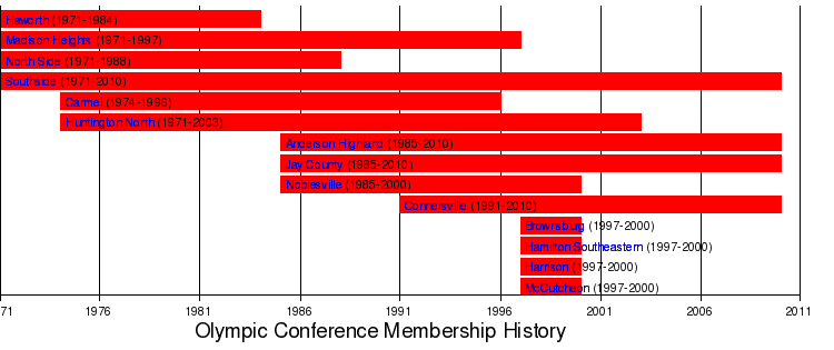 The Olympic Conference was an IHSAA-sanctioned conference located within Delaware, Fayette, Jay, and Madison counties. The conference was formed in 1971 by second (and third) high schools from Anderson, Kokomo, and Muncie, and also included suburban Indianapolis schools that grew too large for their conferences at the time. Many suburban schools ended up outgrowing the Olympic as well, with former members now in the Metropolitan and Hoosier Crossroads "superconferences," as the two contain many of the largest schools in the state.