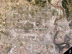 The Omaha–Council Bluffs metropolitan area is a metropolitan area comprising the cities of Omaha, Nebraska, and Council Bluffs, Iowa, and surrounding areas. The area has a population of 915,312 (2015).[1] The metropolitan area, as defined by the Office of Management and Budget, consists of eight counties – five in Nebraska and three in Iowa.[2][3] The area is locally referred to as "the Metro Area", "the Metro", or simply "Omaha". Three of the counties have large urban areas; the other five counties consist primarily of rural communities, most of which have populations of 1,000 or less.