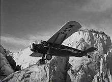 The "cast" also starred a 1929 Hamilton Metalplane, Ford Trimotor and Pilgrim Model 100-B single engine monoplane. All of these types accurately represented the types of aircraft flying in the period depicted by the film. The Hamilton was "Joe's" aircraft and was only used for ground shots although in 2008, one of the movie prop Hamiltons used in the simulated flying scenes for this aircraft was discovered to still exist.[14] The Pilgrim was used in the exciting mine rescue flying scene while the Ford Trimotor also features in another dramatic rescue sequence that ends in a fiery crash. Later in the film, Paul Mantz flying a Boeing Model 100 biplane, flies a spirited aerobatic performance, reprising his earlier scene in Flight From Glory. Only Angels Have Wings has become very popular among enthusiasts of the aircraft of the golden age of aviation.[15]