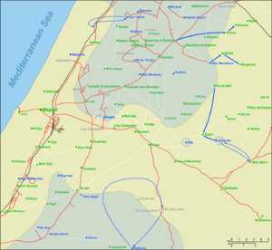 Operation Death to the Invader in fact started with advances against Palestinian Arab localities, not Egyptians. On the night of July 16–17, IDF units set out from Masmiyya, Tell es-Safi and Kfar Menahem to clear their flanks.[8] They mainly captured villages which were depopulated after the fall of Tell es-Safi: Jilya, Qazaza, Idnibba and Mughallis.[4] The southern wing took Zayta and staged a raid on Bayt Jibrin. At the same time, forces from Gan Yavne circled Wadi Sukreir and raided the Sukreir Bridge. The Egyptians returned artillery fire on Gan Yavne, Bitzaron and Hatzor.[8]