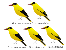 Subspecies diffusus breeds in China and is widespread across India during winter, mainly in the northeastern parts and in the peninsular region. The population in the Andaman and Nicobar Islands are resident. The subspecies in the Andamans, O. c. andamanensis has all black wings while O. c. macrourus of the Nicobars has a very broad nape band so that only the top of the head is yellow. The wings are all black with a yellow primary covert patch. The calls of the Andaman and the Nicobar subspecies are said to be quite different, the latter having a more modulated call note.[3][4] The evolutionary history of this group of orioles is complex and there may be more cryptic species within the group.[5] In the Southeast Asian populations some geographic trends include a reduction of yellow on the forehead and a decreased brightness in the yellow plumage from north to south. Females from southern populations are more greenish on the back and tail and there are no yellow spots on the tips of the secondaries as in northern populations.[6]