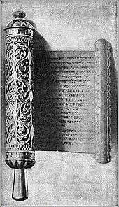 Before the reading of the Megillah on Purim, both at night and again in the morning, the reader of the Megillah recites the following three blessings and at the end of each blessing the congregation then responds by answering "Amen" after each of the blessings.[37] At the morning reading of the Megillah the congregation should have in mind that the third blessing applies to the other observances of the day as well as to the reading of the Megillah:[37]