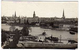 Panorama view of Riga seen from Pārdaugava side of the Daugava River. Vintage viewcard from the early 20th century.