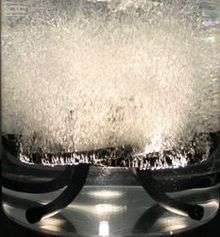 Coarse bubble aeration is a type of subsurface aeration wherein air is pumped from an on-shore air compressor.[4] through a hose to a unit placed at the bottom of the water body. The unit expels coarse bubbles (more than 2mm in diameter),[5] which release oxygen when they come into contact with the water, which also contributes to a mixing of the lake's stratified layers. With the release of large bubbles from the system, a turbulent displacement of water occurs which results in a mixing of the water.[3] In comparison to other aeration techniques, coarse bubble aeration is very inefficient in the way of transferring oxygen. This is due to the large diameter and relatively small collective surface area of its bubbles[3]
