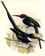 The paradise jacamar (Galbula dea) is a small, approximately 30 cm (1 ft) long bird with a long pointed tail, dark brown cap, white throat and long needle-like bill. It has dark greenish blue plumage with iridescent wings. Both sexes are similar.