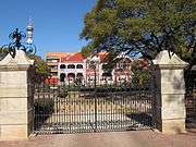 The first building here was a Swiss Chalet imported ready to assemble in 1897.[1] In 1909 Baker and Masey were employed to design a new house and the current Villa Arcadia was completed with lot of input and design changes from the owner Florence Philips. The house features a long veranda on the ground floor fronted by eleven arches with extensive views, stretching past the M1 motorway and overlooking the suburbs of Saxonwold, Forest Town and the city's zoo. A music room was added to the house by Baker, separated from the house by an elegantly landscaped cloistered courtyard.