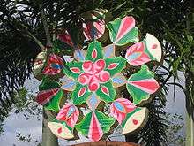 Nowadays, the materials range from plastic, shells, glass, beads, foil, feathers, hemp, leaves, seeds, soft drink straws, wood and even metal.[7] They usually come in various sizes, from small, tinsel and foil lanterns to gigantic ones that are electrically lit at night, and may have one, three or more tails aside from the ubiquitous two. Some have a surrounding "halo," and the number of points on the star usually ranges from four to around ten (however, higher numbers exist). As for stellate patterns, more complex shapes that are seen are the rose, the bromeliad, the snowflake and the sea urchin.