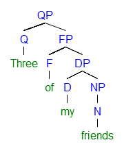 In 1995, Guillermo Lorenzo proposed a partitive (π), which is equivalent to the meaning of "out of" in English, is a functional category by itself and projects to a phrasal level. A partitive phrase (πP) is selected by the Numeral (Num) and in turn the partitive head (π) selects the following DP. A Spanish example is shown below:[1]