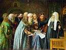 Patriarch Job refusing to recognize False Dmitry I as Ivan IV's son (19th-century painting by Peter Geller).